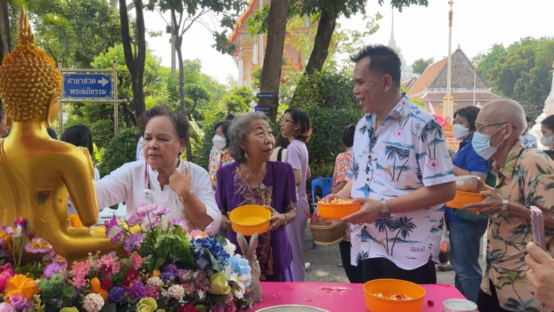 วันที่ 13 เม.ย. 67 ที่วัดชมภูเวก ต.ท่าทราย อ.เมืองนนทบุรี จ.นนทบุรี ประชาชนแห่เข้ามาทำบุญตักบาตร สรงน้ำพระสงฆ์ เพื่อร่วมสืบสานประเพณีไทย ในเทศกาลสงกรานต์วันแรก บรรยากาศเป็นไปด้วยความคึกคัก โดยมีนายสุรพันธ์ ไวยากรณ์ สส.พรรคก้าวไกล เขต 1 จ.นนทบุรี ดร.ชัยเมศร์ ชัยพัชรกุลพงษ์ หรือดร.แก้ว ประธานคณะกรรมการตรวจสอบและติดตามบริหารงานตำรวจ (กต.ตร.) จังหวัดนนทบุรี และทีมงาน เข้าร่วมกิจกรรม พร้อมแจกไอศกรีมดับร้อนให้ประชาชนที่เดินทางมาร่วมงานกันจำนวนมาก นอกจากนี้ยังเดินทางต่อมาไหว้สักการะศาลหลักเมือง เพื่อความเป็นสิริมงคลในช่วงเทศกาลสงกรานต์ ปี 2567