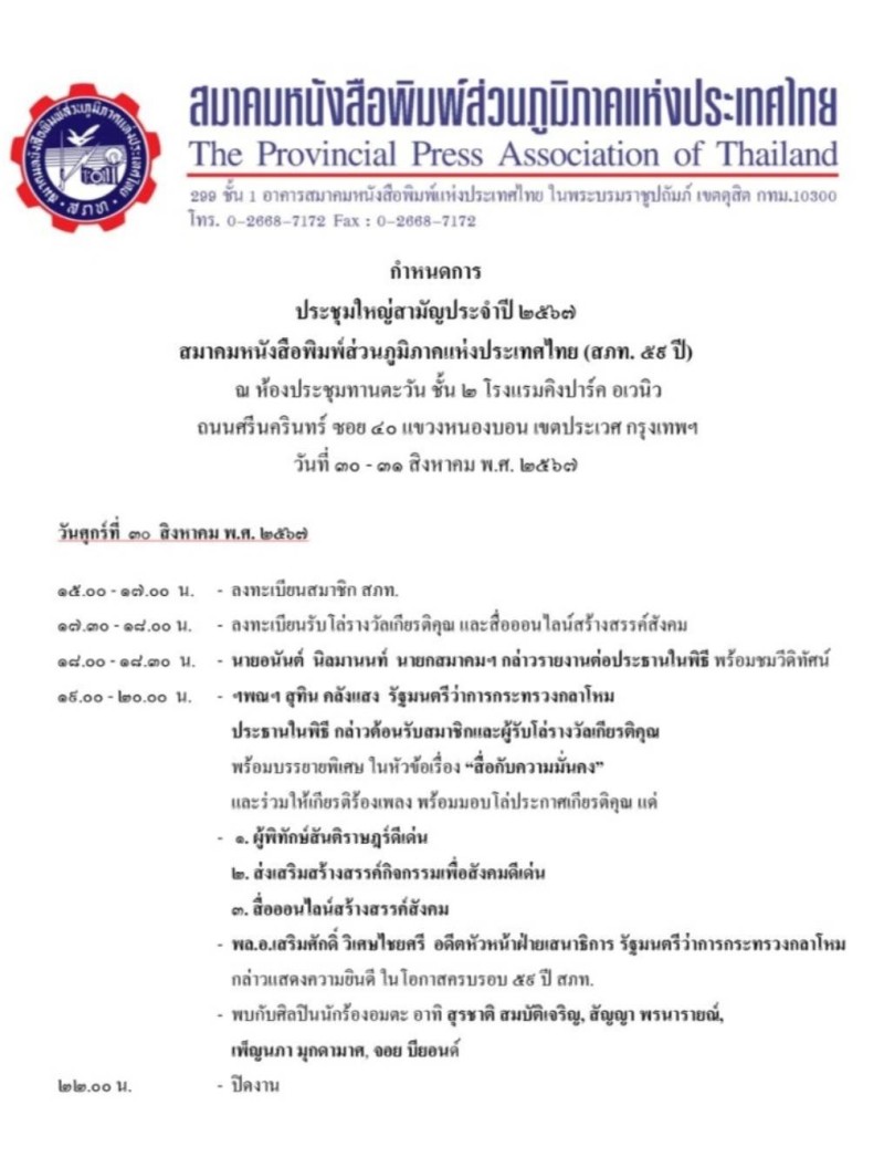 สมาคมหนังสือพิมพ์ส่วนภูมิภาคแห่งประเทศไทย ครบรอบ 59 ปี จัดงานประชุมใหญ่สามัญประจำปี 2567 พร้อมทั้งมอบรางวัลตำรวจ ในสาขา “ผู้พิทักษ์สันติราษฎร์ดีเด่น”